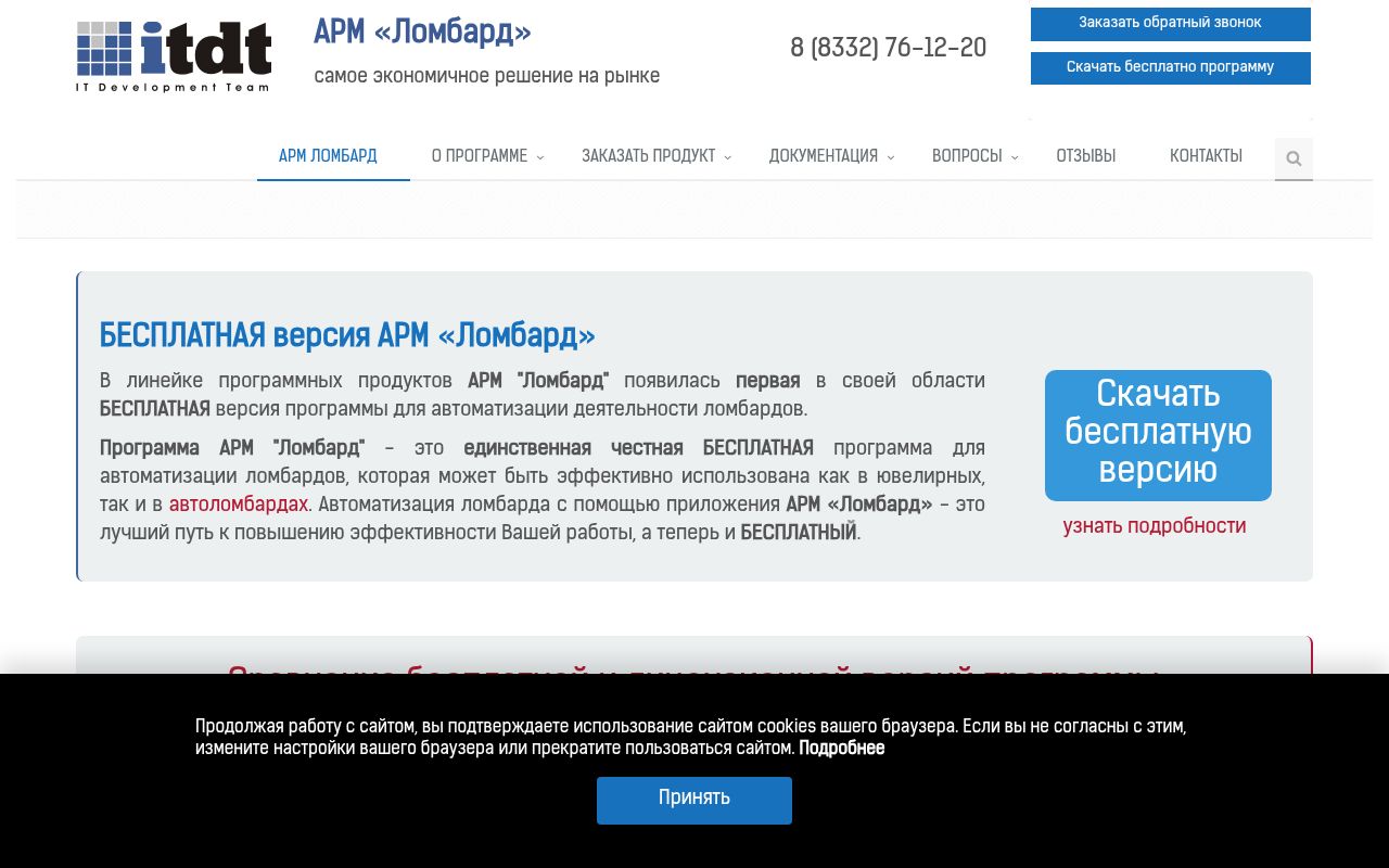 АРМ «Ломбард» — это «рабочая лошадка» для ломбардного бизнеса. Решение не гонится за модным дизайном, но предлагает крепкий функционал, юридическую точность документов и возможность работы на бесплатном системном ПО (Linux, Open Office), что делает его одним из самых экономически эффективных вариантов на рынке.