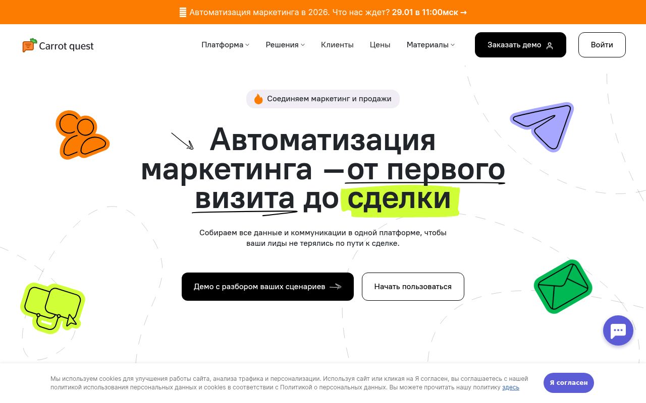 Решение проблемы: Carrot quest разработан как экосистема Conversational Marketing (разговорного маркетинга), объединяющая данные о поведении пользователя с инструментами коммуникации. Система не просто ждет вопроса от клиента, а сама инициирует диалог в нужный момент с помощью триггерных сообщений, поп-апов и чат-ботов, основанных на действиях посетителя.