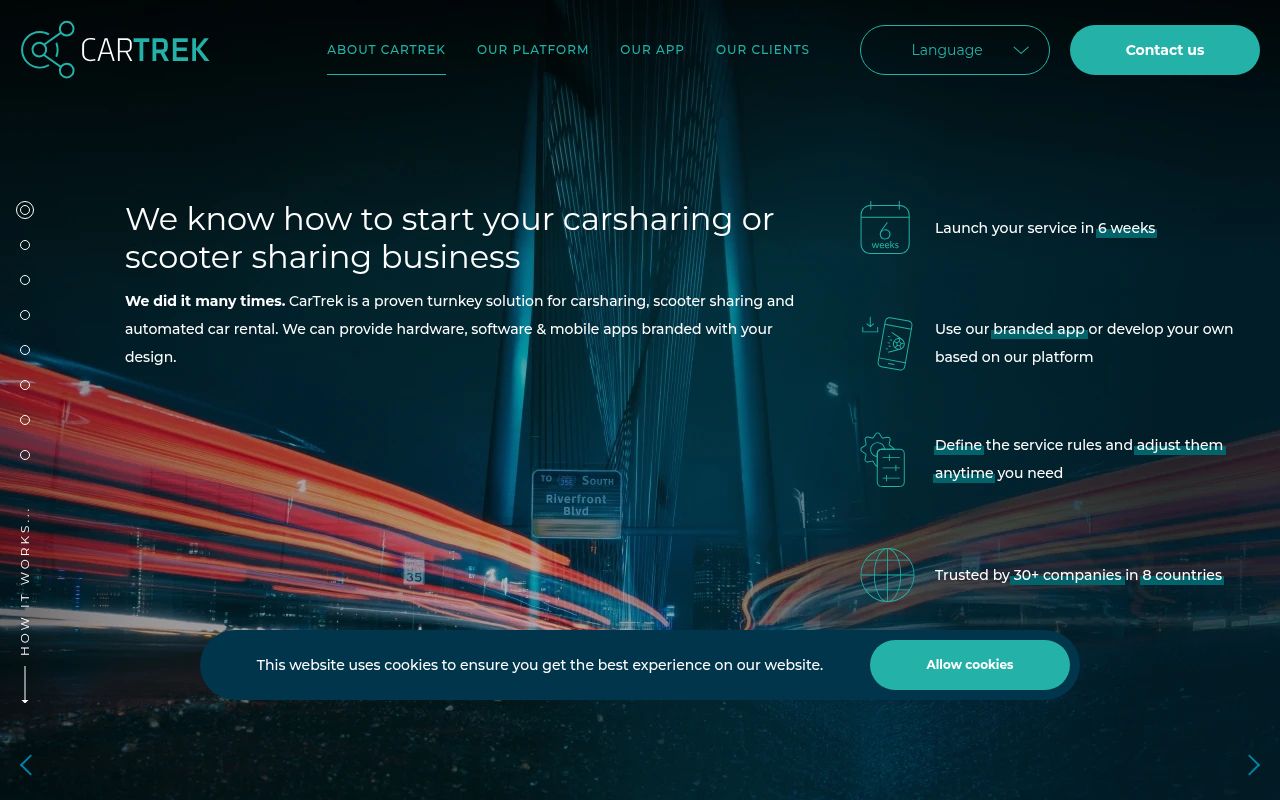Платформа разрабатывается российской компанией (резидент Сколково) с целью сделать технологии шеринга доступными и простыми во внедрении, позволяя запустить бизнес за 6 недель. Основная ценность CarTrek заключается в отсутствии платы за внедрение (Set-up fee) и гибкой модели монетизации, где оплата производится только за фактически подключенные к системе автомобили.