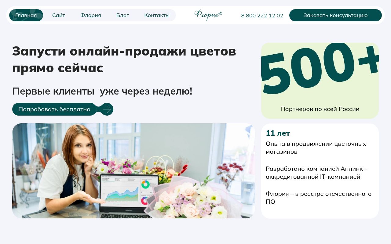 Флория позиционирует себя как готовое отраслевое решение «все-в-одном», объединяющее CRM-систему, складской учет и готовый интернет-магазин. Это позволяет запустить онлайн-продажи и автоматизировать рутину без привлечения сторонних разработчиков.