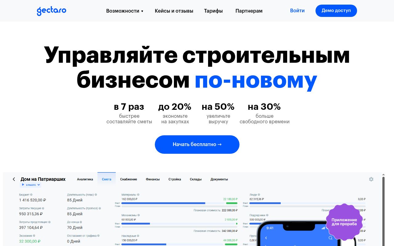 Gectaro — это мощный отраслевой стандарт для малого и среднего строительного бизнеса. Сочетание глубокого понимания специфики стройки, удобного интерфейса и функциональности ERP-системы делает его одним из лучших решений на рынке для тех, кто хочет навести порядок в сметах, финансах и на объектах.