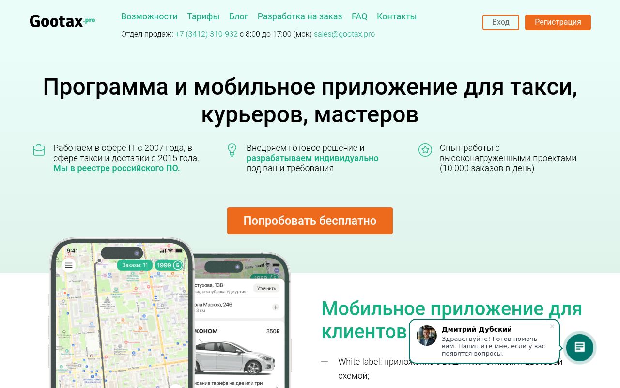 Гутакс — это мощный комбайн для тех, кто готов инвестировать в создание собственного бренда такси или доставки. Это не просто CRM, а полноценная ERP для транспортного бизнеса. Решение идеально подходит для компаний, выросших из «Excel и тетрадки», но требует бюджета на настройку и запуск приложений.