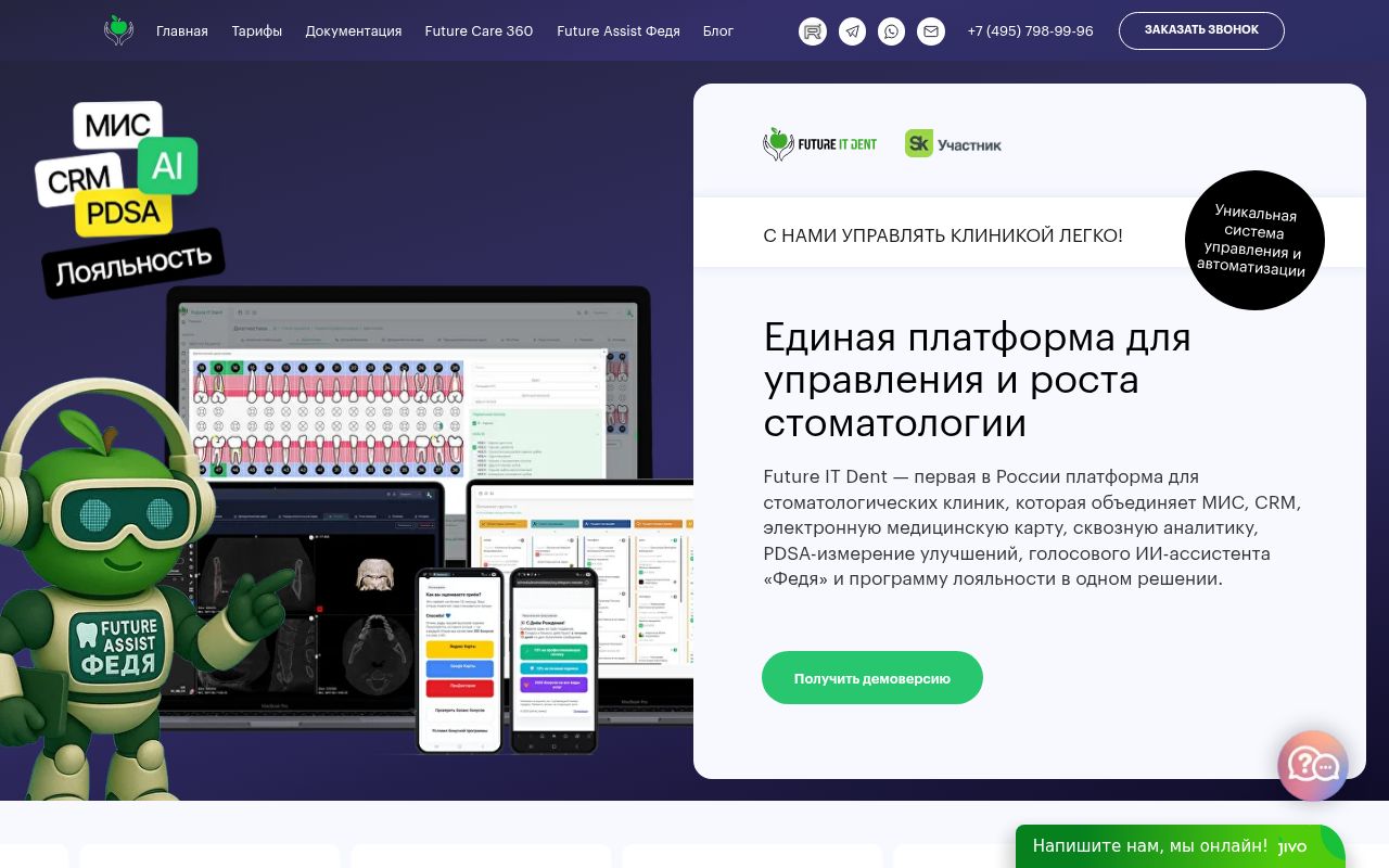 Future IT Dent — это современное и технологичное решение, которое перекрывает потребности 95% стоматологий. Сочетание CRM-инструментов для роста выручки и строгого соответствия медицинским стандартам делает его одним из лидеров в нише Dental-софта.